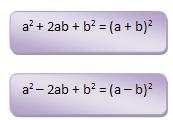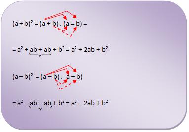 a) O quadrado da soma de duas parcelas [(a + b)2] é igual ao quadrado da primeira parcela [a2], mais o dobro do produto das duas parcelas [2ab], mais o quadrado da segunda parcela [b2]. b) O quadrado da diferença entre duas parcelas [(a – b)2] é igual ao quadrado da primeira parcela [a2], menos o dobro do produto das duas parcelas [2ab], mais o quadrado da segunda parcela [b2].