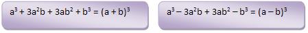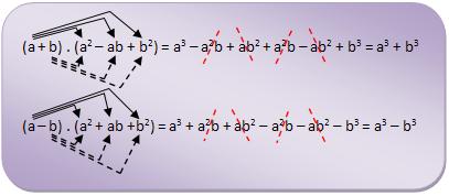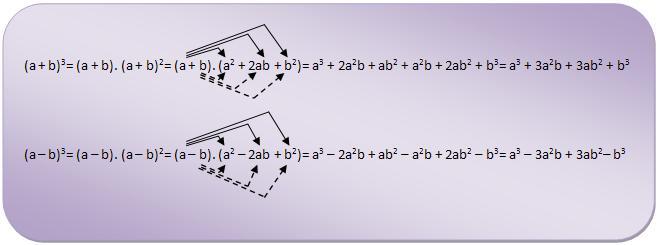 Observações:Cuidado para não confundir o cubo da soma, que é (a + b) 3, com a soma de cubos, que é a3 + b3. Ou o cubo da diferença, que é (a – b) 3, com a diferença entre cubos, que é a3 – b3.